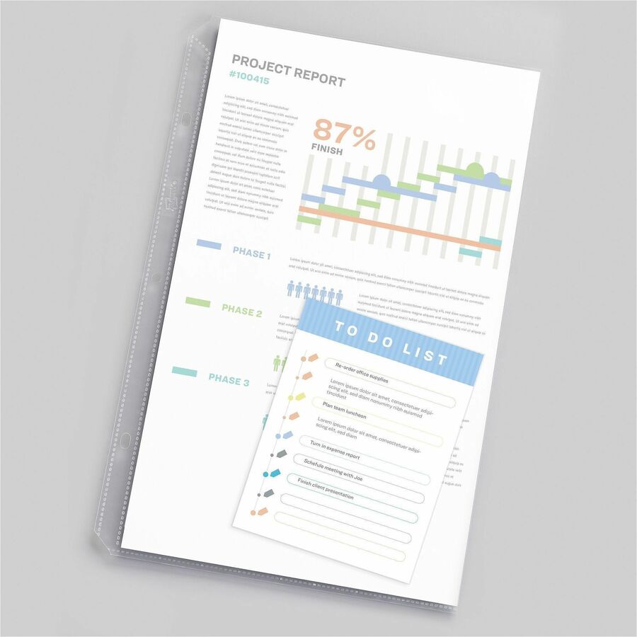 | Marketing Information | Safeguard your documents with heavyweight sheet protectors. Easy Load feature provides a wide top opening so papers slide easily into place. Diamond-clear material delivers a crisp view of your presentation as well as durable protection so you can protect it and show it off. The clear binding edge adds a professional look to your presentations and other documents. The edge is also three-hole punched for easy insertion into three-ring binders. Each polypropylene sheet protector holds one sheet of legal-size paper. |