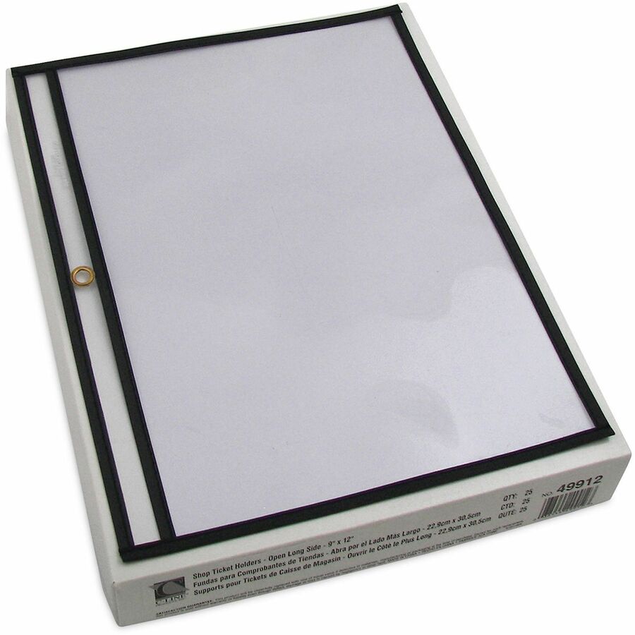 Store and protect work orders, production schedules, inventory cards and more in these stitched shop ticket holders. Use the convenient metal eyelet at top for hanging. Strong, rigid, clear vinyl allows easy visibility of documents on both sides. Reinforced stitched edge prolongs product life. Holders open on the long side. |