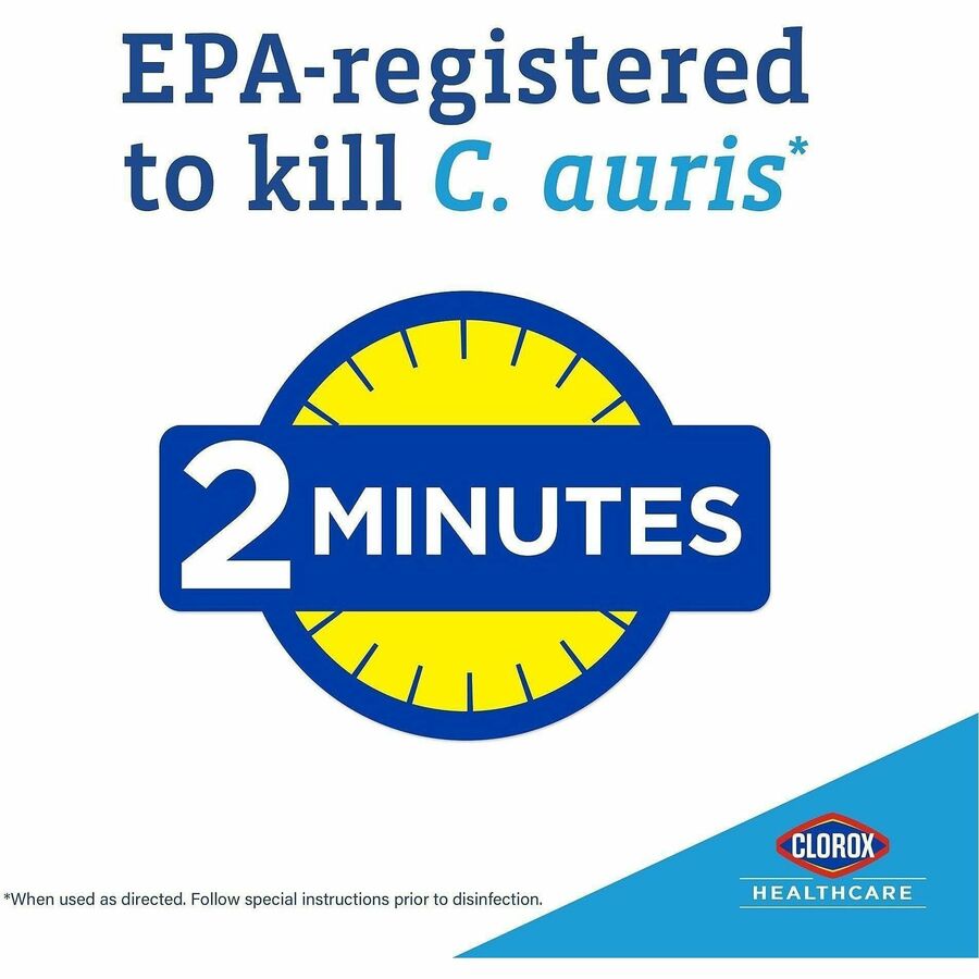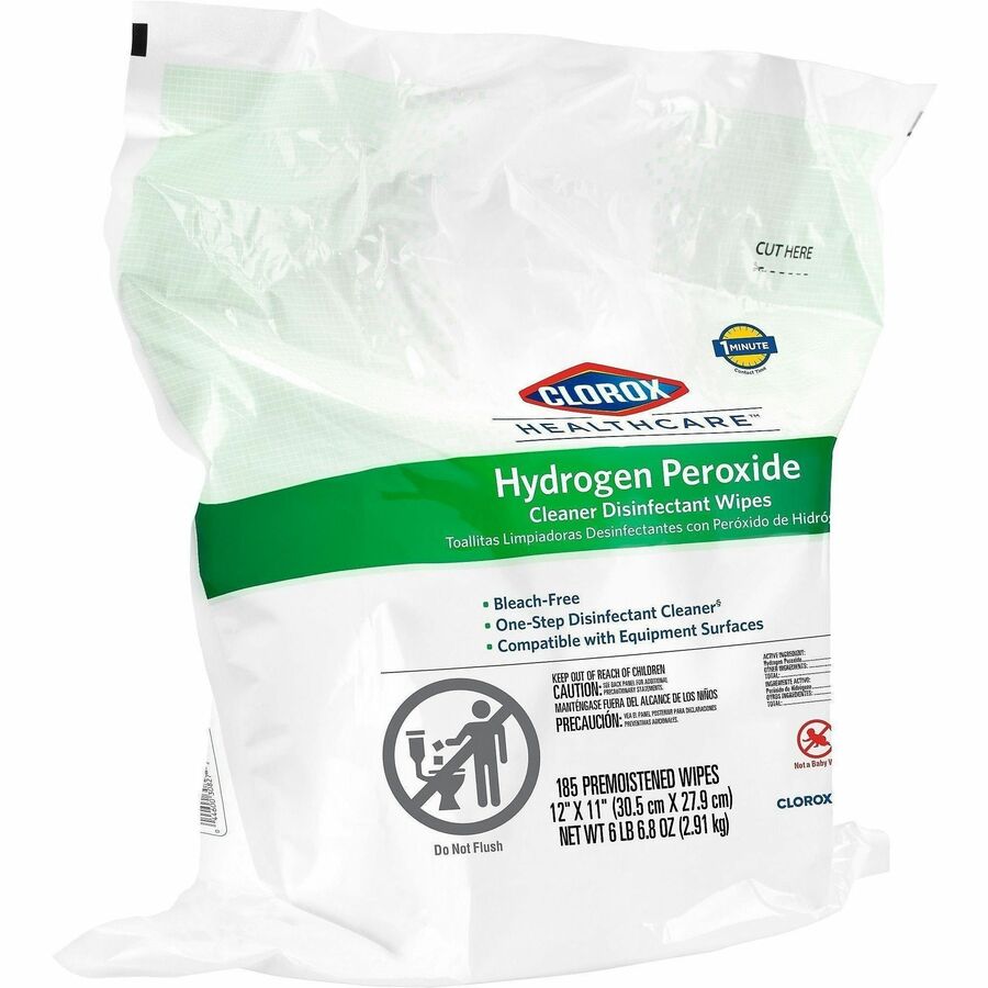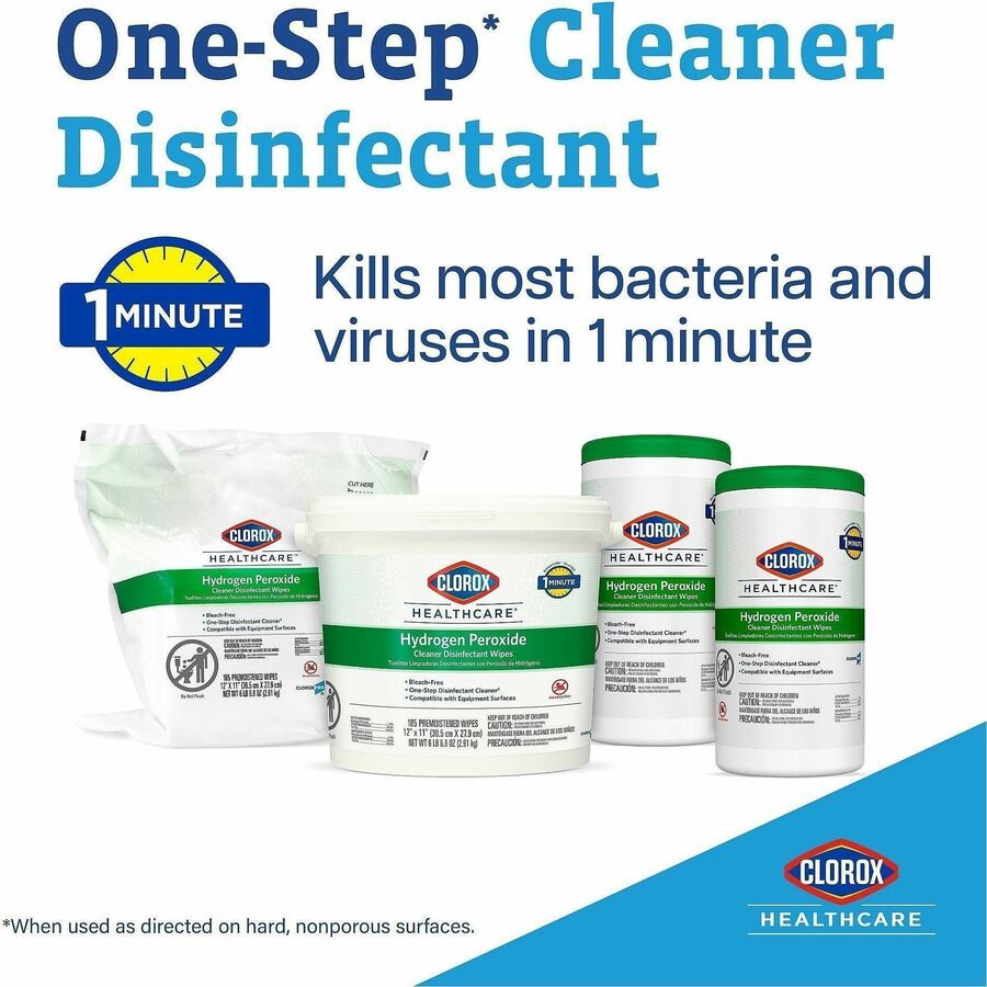 | Marketing Information | For great surface compatibility and less residue, Clorox Healthcare Hydrogen Peroxide Cleaner Disinfectant Wipes leave no harsh chemical odor or fumes and kill bacteria and viruses in 30 seconds. Disinfect with one wipe that is registered to kill C. auris, 13 antibiotic-resistant pathogens and multiple strains of MRSA. This ready-to-use, broad-spectrum disinfectant has a noncorrosive formula suitable for cleaning medical devices, common areas and high-touch surfaces made of materials like stainless steel, painted metals, glass, chrome, glazed tile, plexiglass and sealed fiberglass. Hydrogen peroxide wipes are ideal for daily use in healthcare settings including hospitals, medical facilities, outpatient facilities and long-term care facilities. |