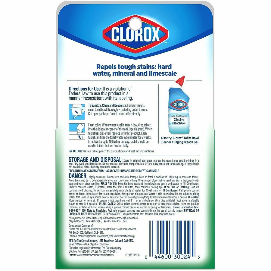 | Marketing Information | Clorox Ultra Clean Toilet Tablets kill 99.9 percent of bacteria and deodorize your toilet with the power of Clorox bleach. This toilet bowl cleaning tablet effectively cleans and prevents stains with each flush, eliminating the need to scrub every time. Each tablet delivers a long-lasting bleach clean and is good for up to three months. Simply drop a tablet into your toilet tank to continuously sanitize, deodorize and clean your toilet every time you flush. Dissolvable cleaning tablets help prevent tough stains and remove hard water, mineral deposits and limescale stains. Toilet tablets are ideal for use in restaurants, cafeterias, offices, hotels, daycares and other commercial facilities. Keep your toilet bowl sparkling fresh and ultra clean with no mess and no fuss with the help of Clorox Ultra Clean Toilet Tablets. |