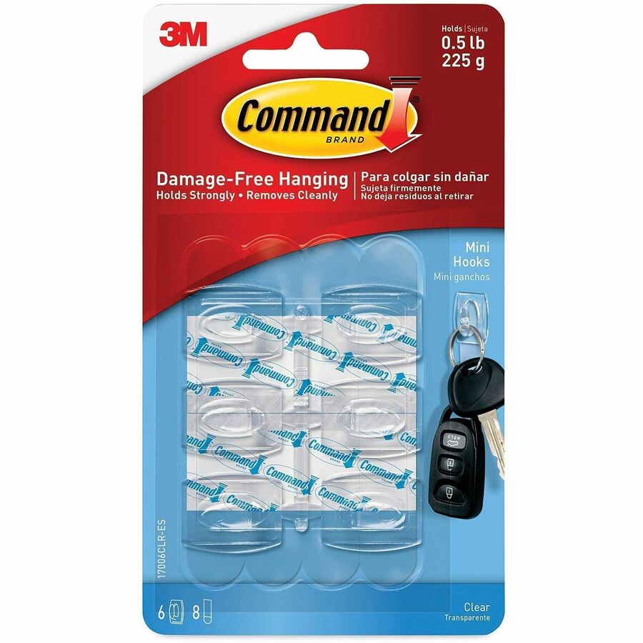 Forget about nails, screws and tacks. Command Clear Mini Hooks offer a fast, easy way to hang and hold a surprising amount of weight. Command Adhesive sticks to many surfaces, including paint, wood, tile and more, yet comes off leaving no holes, marks, sticky residue or stains. Rehanging is as easy as applying a Command Refill Strip so you can take down, move and reuse them again and again. |