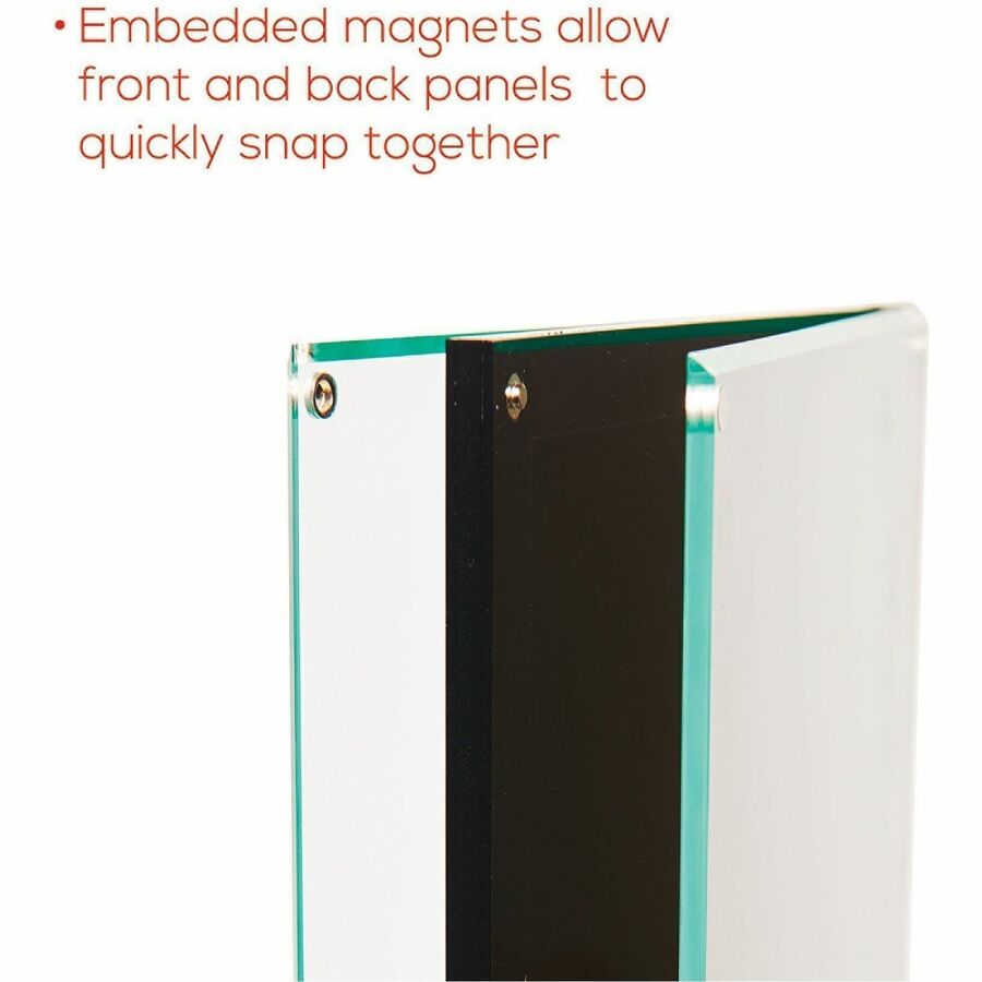 | Marketing Information | Double-sided sign stand offers front and back display of letter-size inserts. Ideal for reception areas, trade shows and waiting rooms. Clear magnetic panels with green-tinted edges allow quick, easy sign changes. Permanent, black back panel frames your messages. Weighted base stabilizes the sign. Sign stand holds up two letter-size inserts and features a metal post and a plastic sign. |