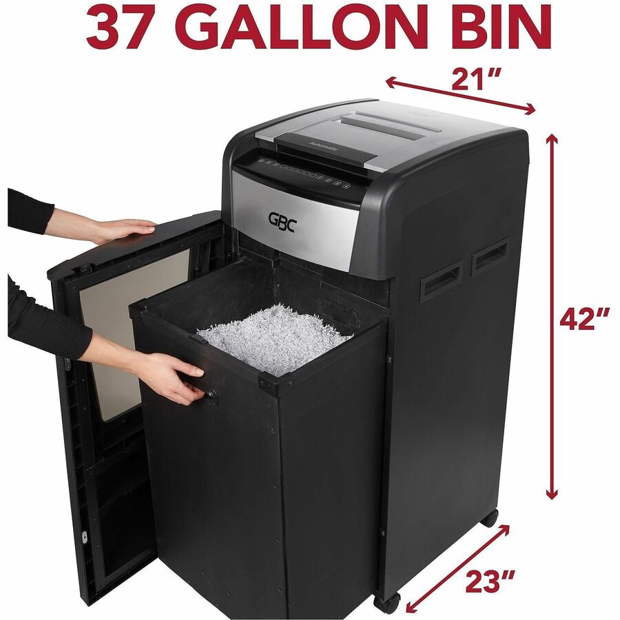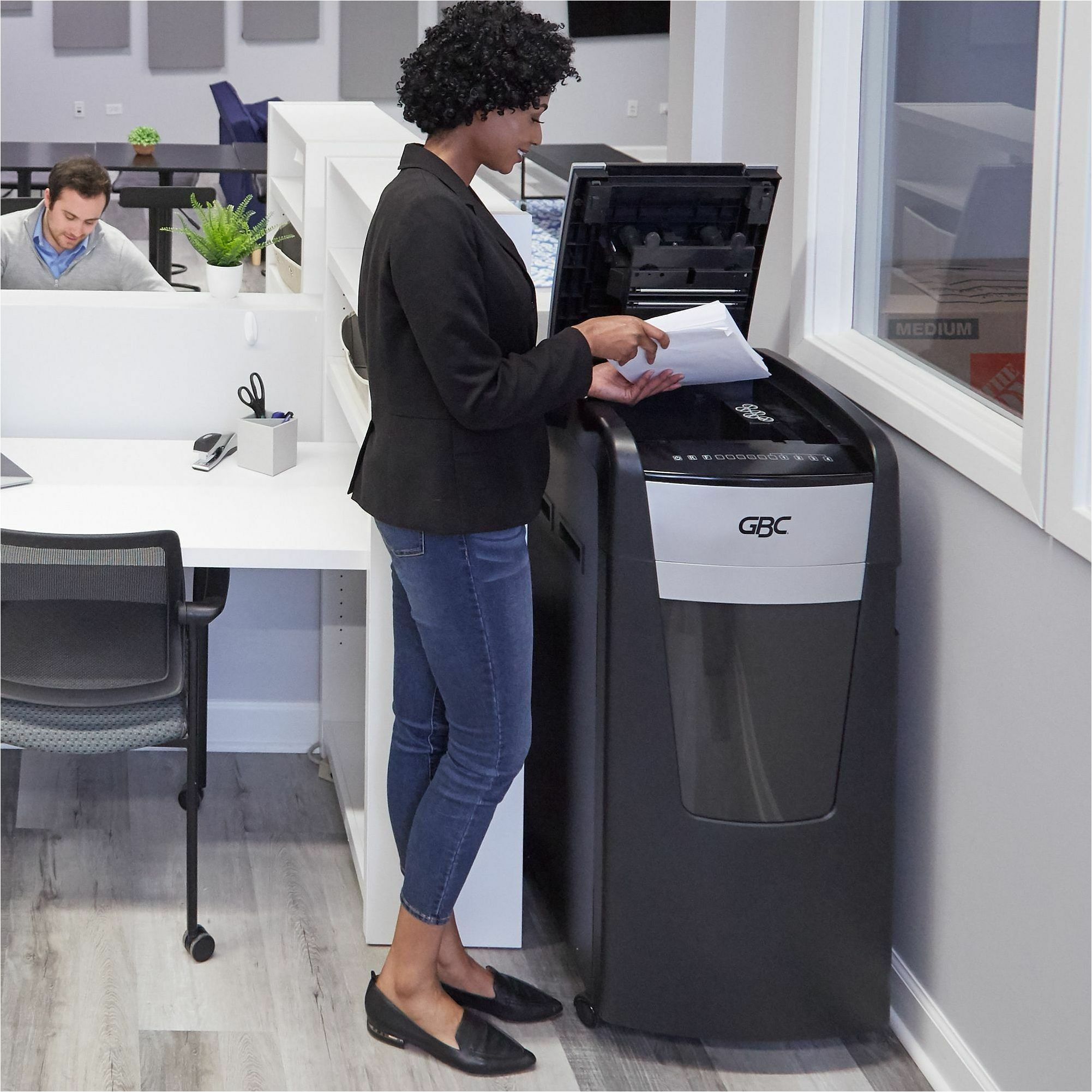 Spend less time shredding and more time on other tasks. GBC AutoFeed+ Super Micro-Cut Shredder takes the manual work out of shredding to make your day easier. Simply stack, shut and walk away. Stack up to 750 sheets in the feeder for automatic shredding or manually feed up to 15 sheets at once. Super micro-cut (P-5) shred style is perfect for shredding confidential or personal information. Shredder runs ultra-quietly to help minimize noisy disruptions in your office. Powerful induction motor and 37-gallon bin let you shred longer without stopping. Runtime is 240 minutes. Auto shred documents, paper clips and staples. Insert credit cards manually. |