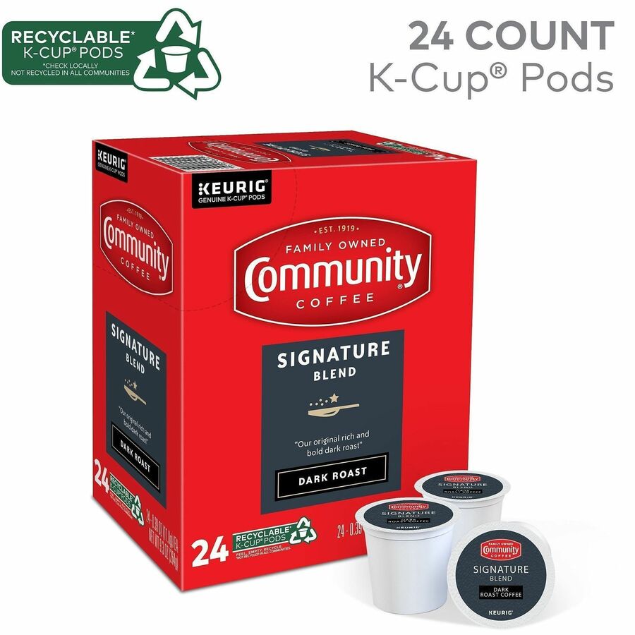 Created more than four generations ago, Signature Blend Dark Roast Coffee is a special blend roasted dark to develop rich, smooth flavor with a deep chocolate profile. Community Coffee's master roasters ensure the exact roast level is achieved to consistently create this deliciously complex coffee that remains a favorite today. It is made with responsibly sourced, 100 percent Arabica beans. Caffeinated coffee comes in airtight, recyclable K-Cup Pods for single-cup brewing systems. K-Cups are easy to use. Simply shake and insert into your Keurig coffee brewer for a delicious cup of coffee. |