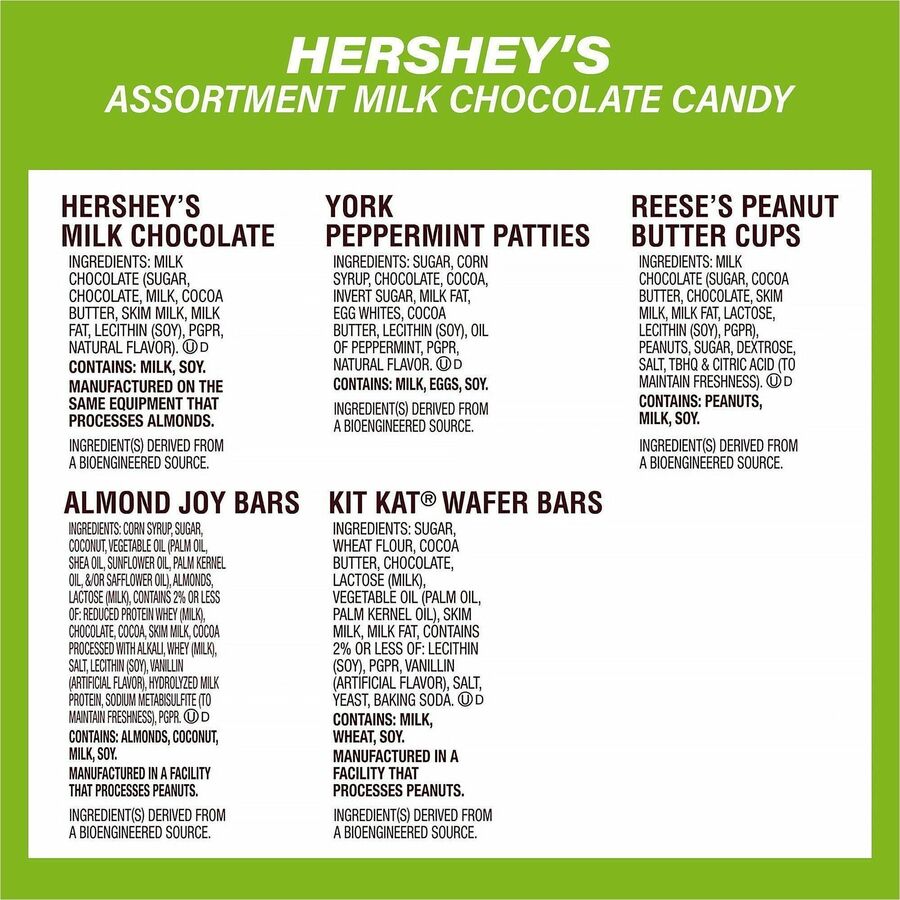 - Hershey's bag contains Hershey's, Reese's, Kit Kat, Almond Joy and York Peppermint Patties