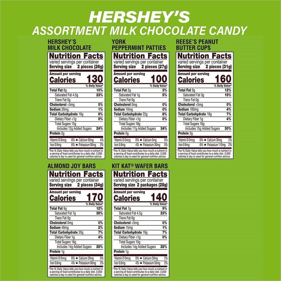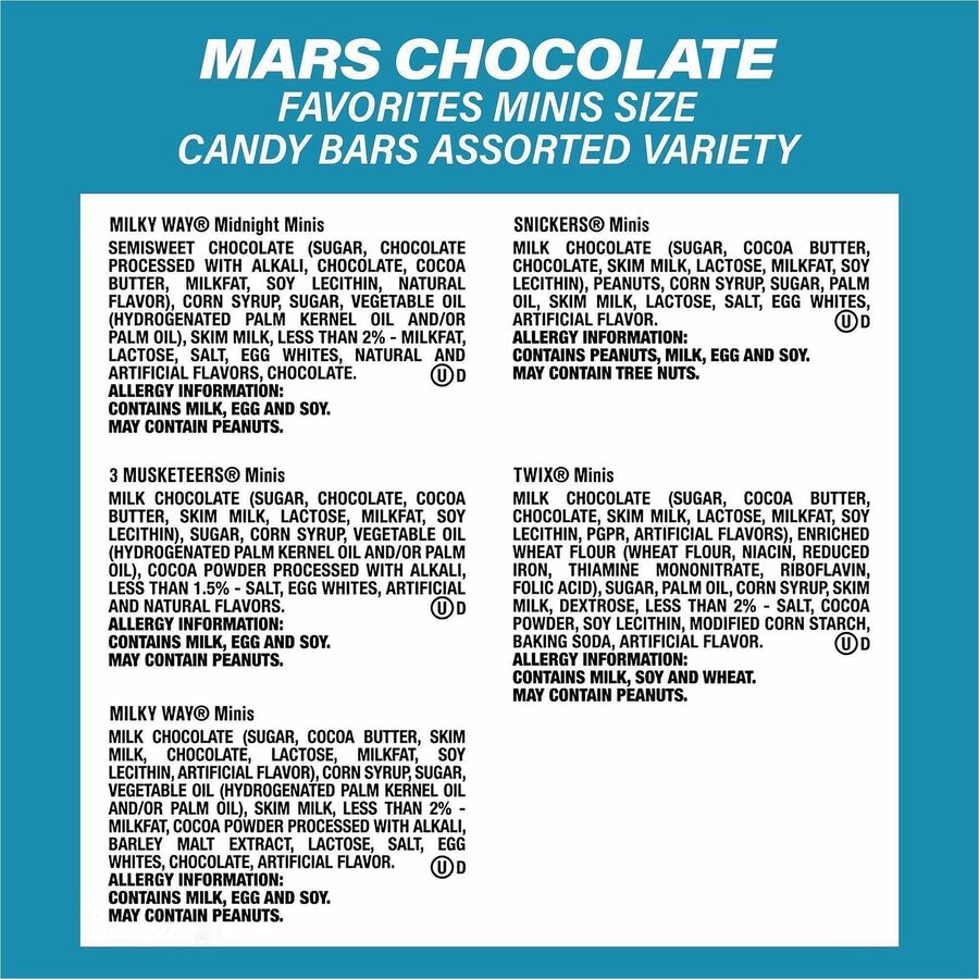 | Marketing Information | Hershey's Assortment Milk Chocolates Standup Bag and Mars Chocolate Favorites Mini Assorted Variety Bag offer the perfect variety to satisfy your sweet tooth. Standup bag contains Hershey's, Reese's, Almond Joy, Kit Kat and York Peppermint Patties. Mini variety bag contains Milky Way Midnight, Milky Way Original, 3 Musketeers, Snickers and Twix Chocolate Bars. Whether you're in the mood for minty dark chocolate, crispy milk chocolate, wafers, caramel, nougat, peanut butter or just pure chocolate, this variety pack has something for everyone. Bring these chocolate favorites to your next party. Fill up the candy dish. Stash it in your desk drawer or pack in your child's lunch for a surprise they'll love. |