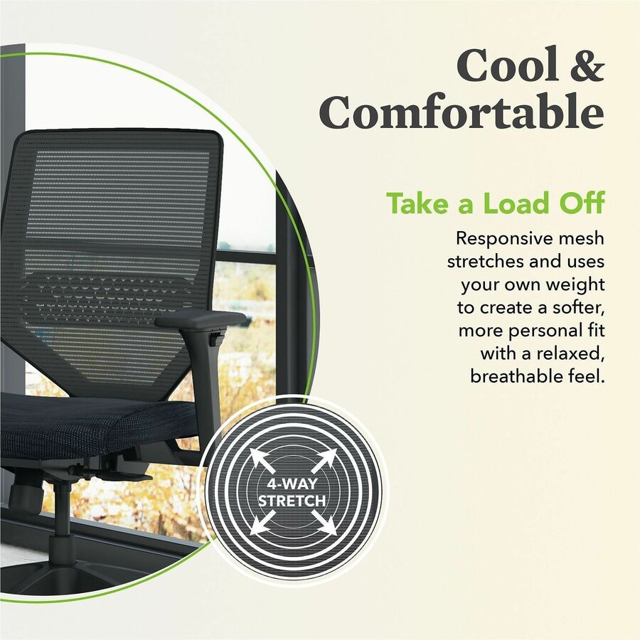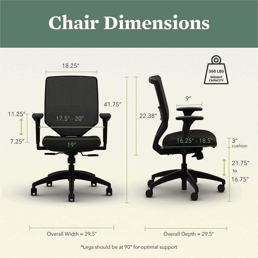 | Marketing Information | Solve is the single seating solution that helps a variety of users achieve optimal comfort. Its flexibility allows everyone to customize their comfort and move more freely and naturally in workstations, collaborative environments, meeting rooms and more. This Solve mid-back task chair features a responsive, ilira-stretch mesh back to provide all-day comfort and support. Synchronized seat and back provide proper balance, alignment and lumbar support and can be adjusted with a single lever. Synchro-tilt mechanism reclines the back at a higher ratio than the seat for proper back alignment. Seat glides forward when the back flexes to provide a more natural posture. Adjustable-height arms move up and down for shoulder and upper body support. Functions also include 360-degree swivel, pneumatic seat-height adjustment from 18" to 23" , tilt tension and upright tilt lock. Waterfall seat edge promotes better leg circulation. Weight capacity is 300 lb. |