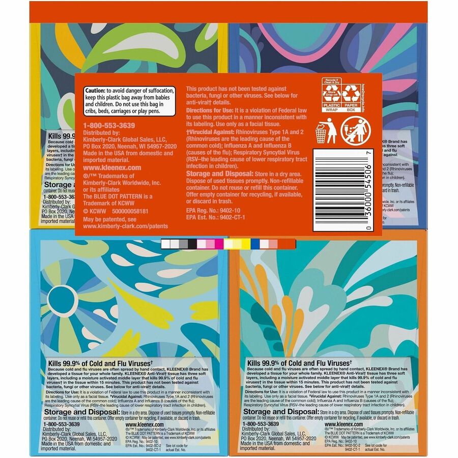 | Marketing Information | Because cold and flu viruses are often spread by hand contact, Kleenex brand has developed a tissue for your whole business. Each anti-viral tissue has three soft layers, including a moisture-activated middle layer that kills 99.9 percent of cold and flu viruses in the tissue within 15 minutes. It's virucidal against Rhinoviruses Type 1A and 2, Influenza A and B, and Respiratory Syncytial Virus. Each box comes with germ-fighting tissues, and each tissue features small blue dots on the interior layer to signal that they're antiviral. So whether you are a teacher caring for children, a commercial operator with a big staff or a business owner who cares about your employees' health, these antiviral facial tissues can be an important part of keeping your crew healthy year-round. |