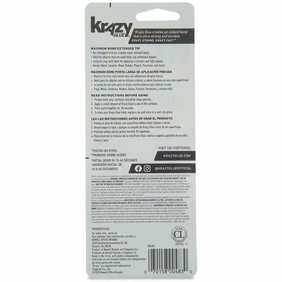 | Marketing Information | Extra-strength, advanced formula Krazy Glue provides an extra strong, durable shock-resistant bond. The precision tip applicator has an extended, no-clog tip with an easy-open, easy-seal hanger cap to reach tight spots. The large size and sure-grip panel on the container make it easy to apply. Ideal for ceramics, wood, plastic (PVC, ABV, ERP), rubber, metal, and glass. |
