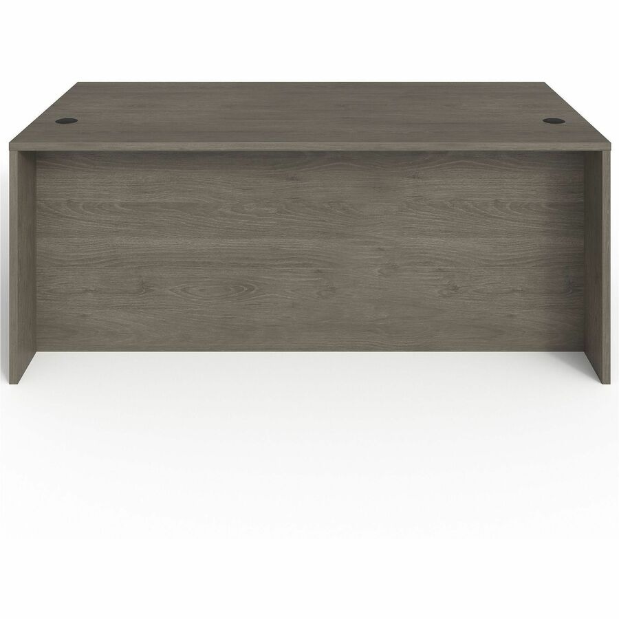 | Marketing Information | Double-pedestal desk is part of the elegant, Lorell Prominence 2.0 Series that is perfect for your executive office. Durable, Gray Elm laminate surface is mar-resistant, burn-resistant and impact-resistant to withstand daily work life. The 1" thick top with matching 3mm edgebanding is made with 45 lb. density particleboard and finished on both sides with high-performance, thermally fused melamine. Freestanding, 72" wide desk features a full modesty panel, two grommets in the top, and two 3/4 pedestals with locking drawers to secure files and supplies. One pedestal includes two file drawers while the other pedestal includes two box drawers for supplies and one more file drawer for additional file space. File drawers hold letter-size or legal-size hanging files with included hangrails. Box and file drawers have 100 lb. full-suspension, ball-bearing slides. The 3/4" adjustable glides allow desk to remain level on uneven surfaces. Desk ships fully assembled so it's ready for immediate use. |