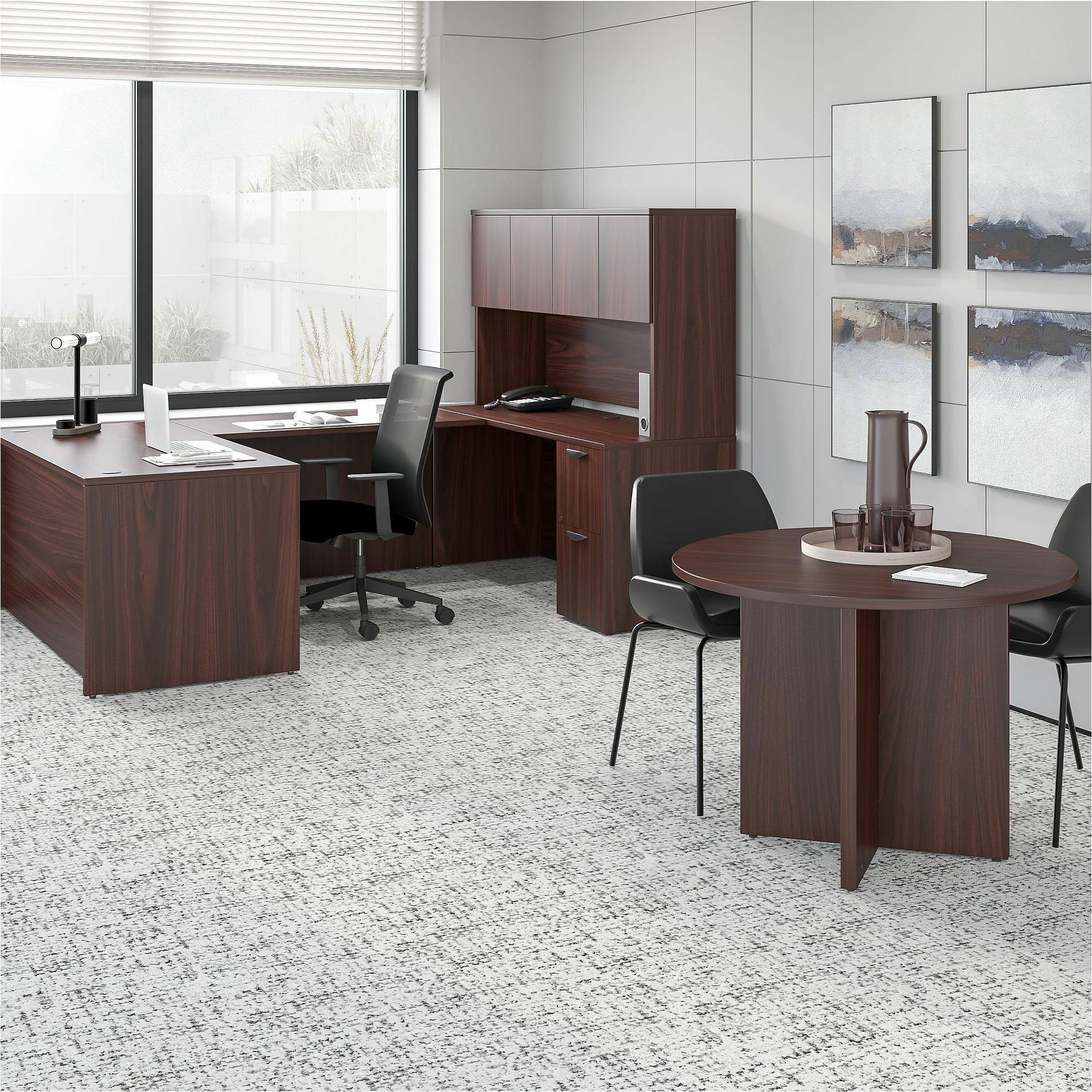 | Marketing Information | Round conference table is part of the Lorell Prominence 2.0 Series that offers an elegant design perfect for your executive office suites. It seats four people. Durable, Mahogany laminate surface is mar-resistant, burn-resistant and impact-resistant to withstand hectic, daily work life. The 1" thick top features matching 3mm edgebanding. Table is made with 45 lb. density particleboard and finished on both sides with high-performance, thermally fused melamine. It features a stable, X-shaped base and 3/4" adjustable glides to remain level on uneven surfaces. Weight capacity is 193 lb. |