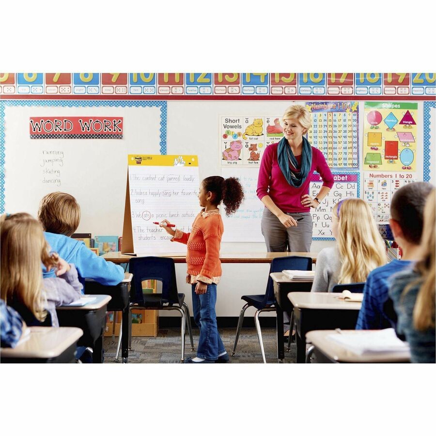 | Marketing Information | With sheets that can stick almost anywhere, Post-it Easel Pads foster the imaginative thinking that lays the foundation for future growth. They are ideal for students and small group learning in the classroom. The pad cover folds to convert to an easel stand for tabletop use. The bright-white sheets with primary ruling resist marker bleed-through and are perfect for new writers. Sheets stick to most surfaces and can be repositioned again and again without surface damage so work can be displayed in the classroom or hallway. They can be refilled with Post-it Wall Pads (sold separately), which are available with plain white or primary-ruled paper. |