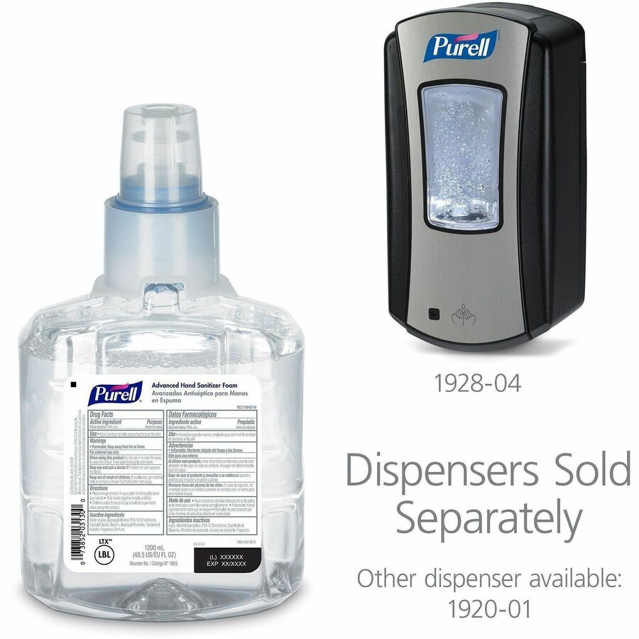 | Marketing Information | Advanced Instant Hand Sanitizer Foam kills more than 99.99 percent of most common germs. The 70 percent ethyl alcohol formula is milder on skin than handwashing and is enhanced with four different skin-conditioning agents that help maintain skin health. Controlled-collapse refill bottle holds its shape as it empties for a more attractive overall appearance. Sanitary-sealed refill helps prevent contamination. The 1200 ml. refill comes with a fresh dispensing valve and is designed for use in the PURELL LTX-12 Dispenser that is fully ADA-compliant. Removable pump promotes easier recycling. |