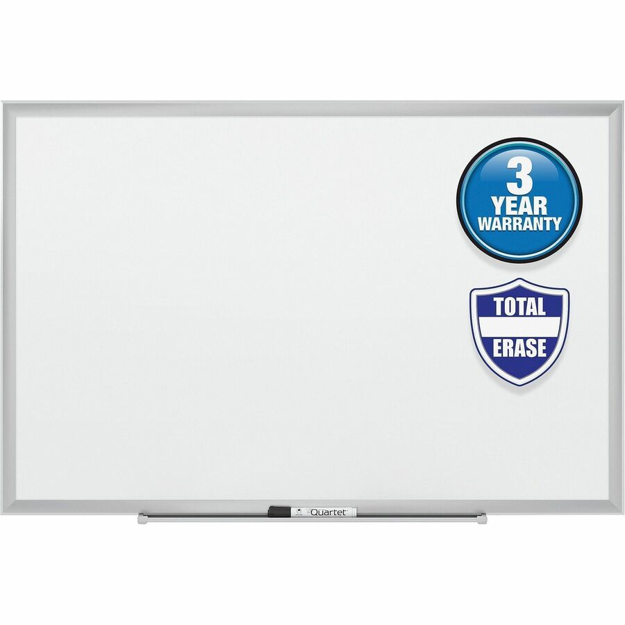 Melamine surface. Anodized aluminum frame. Includes repositionable marker tray and 1 Quartet® dry erase marker. 36" x 48". |