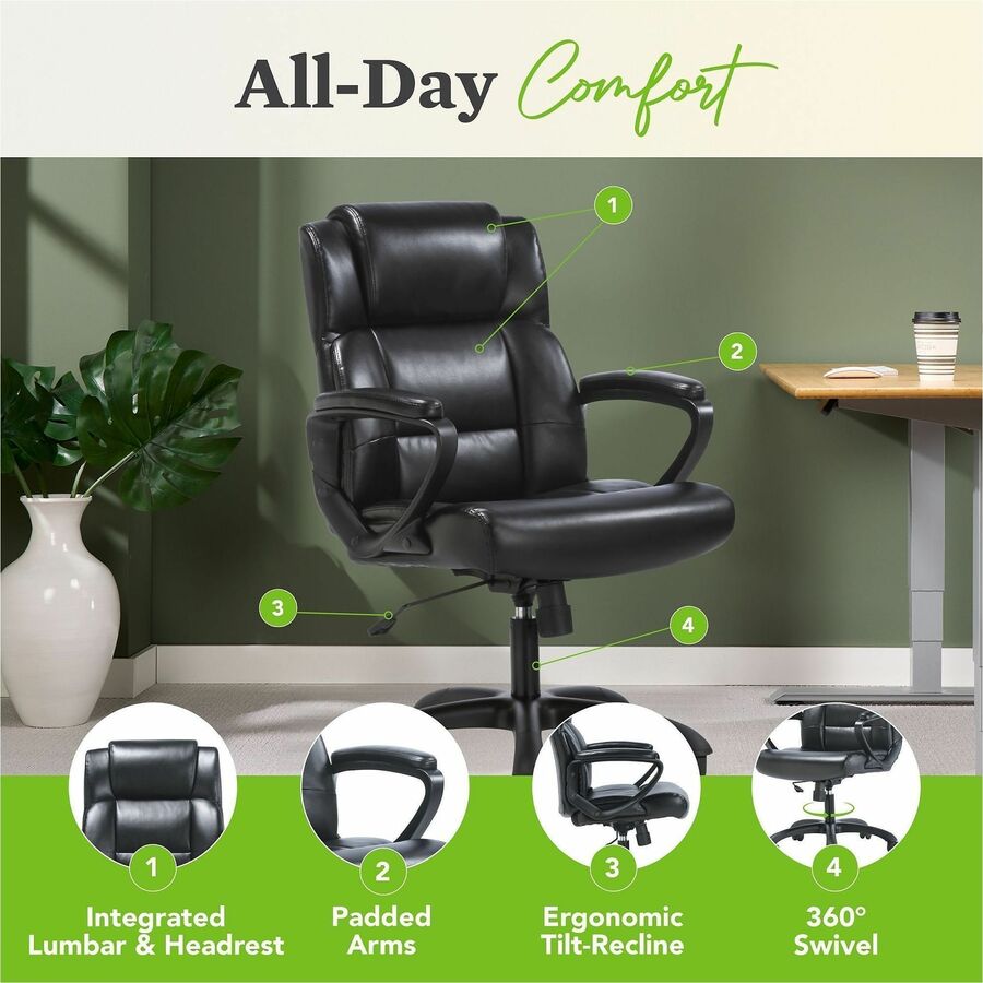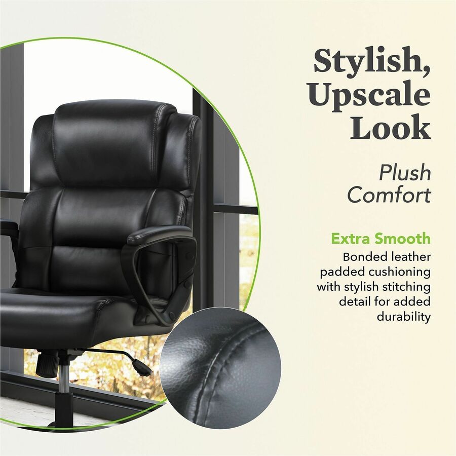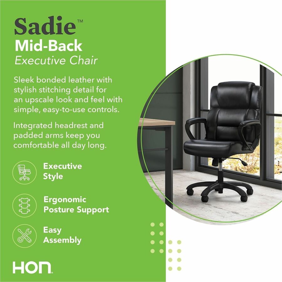 Mid-back executive chair features luxurious SofThread leather for an upscale look and feel, making it a smart and stylish solution for any application. It offers simple and intuitive controls such as pneumatic seat-height adjustment, 360-degree swivel, tilt tension and tilt lock for added customizability and comfort. Contemporary tapered arms add to the modern appeal. The comfort and stylish look make it a perfect addition to the office or home. This chair meets or exceeds industry standards for safety and durability. |