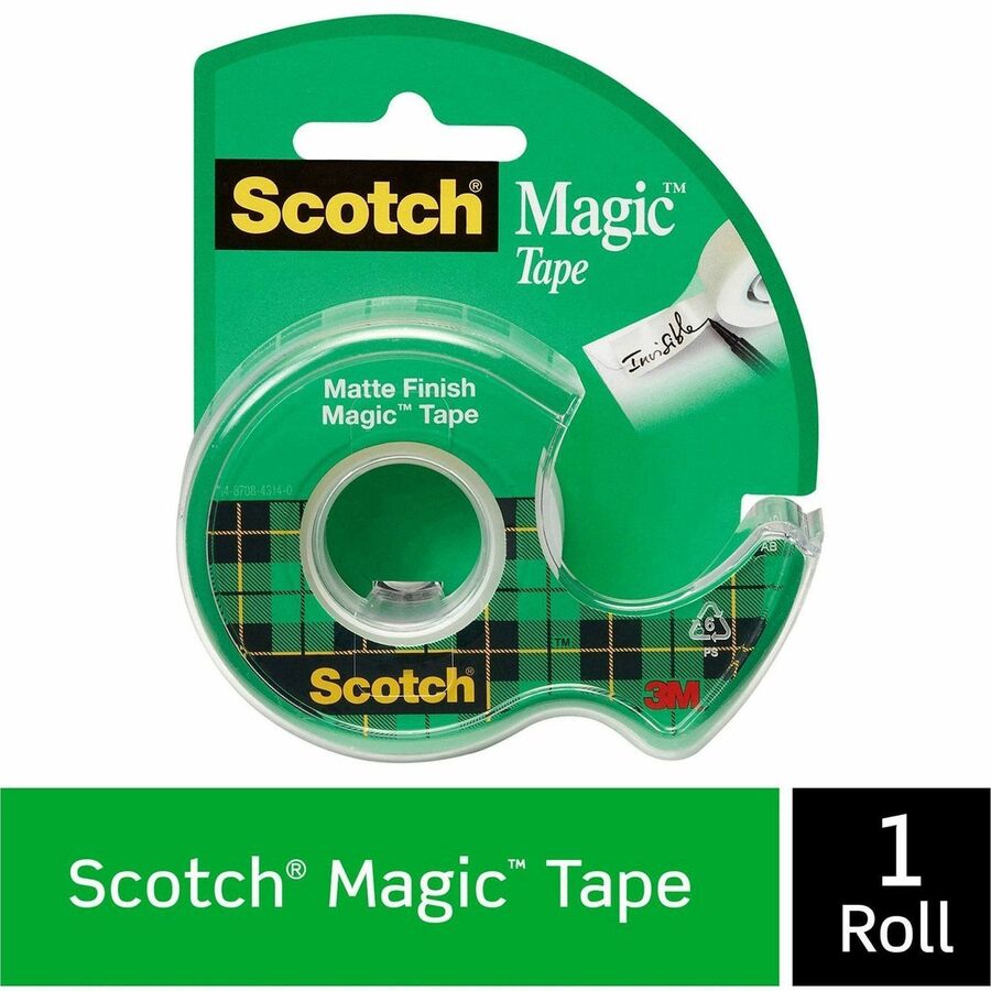| Marketing Information | Scotch Magic Tape is the original matte finish, invisible tape. It disappears on most papers so it's easy to scan and read documents. This versatile tape is ideal for permanent paper mending and many other uses. It pulls off the roll smoothly, cuts easily and resists splitting and tearing. Tape will not dry out or yellow. Write on it with pen, pencil or marker. It is also photo-safe (determined in accordance with ISO Standard 18916). Tape comes on a compact handheld dispenser that stores easily in a drawer. |