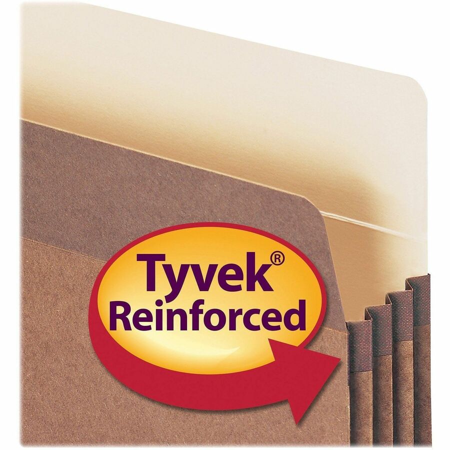 | Marketing Information | Great for managing bulky records, these sturdy file pockets feature an accordion design to hold up to a 3-1/2" thick stack of letter-size documents. Durable, tear-resistant reinforcement at the top of the gussets makes the sides of these pockets virtually tearproof. Straight-cut tabs offer plenty of labeling room. Other features include 12-1/2 point redrope back with 11 point manila liner, rounded top corners, 6-1/2" high redrope gussets and double-thick, 9 point redrope front. |