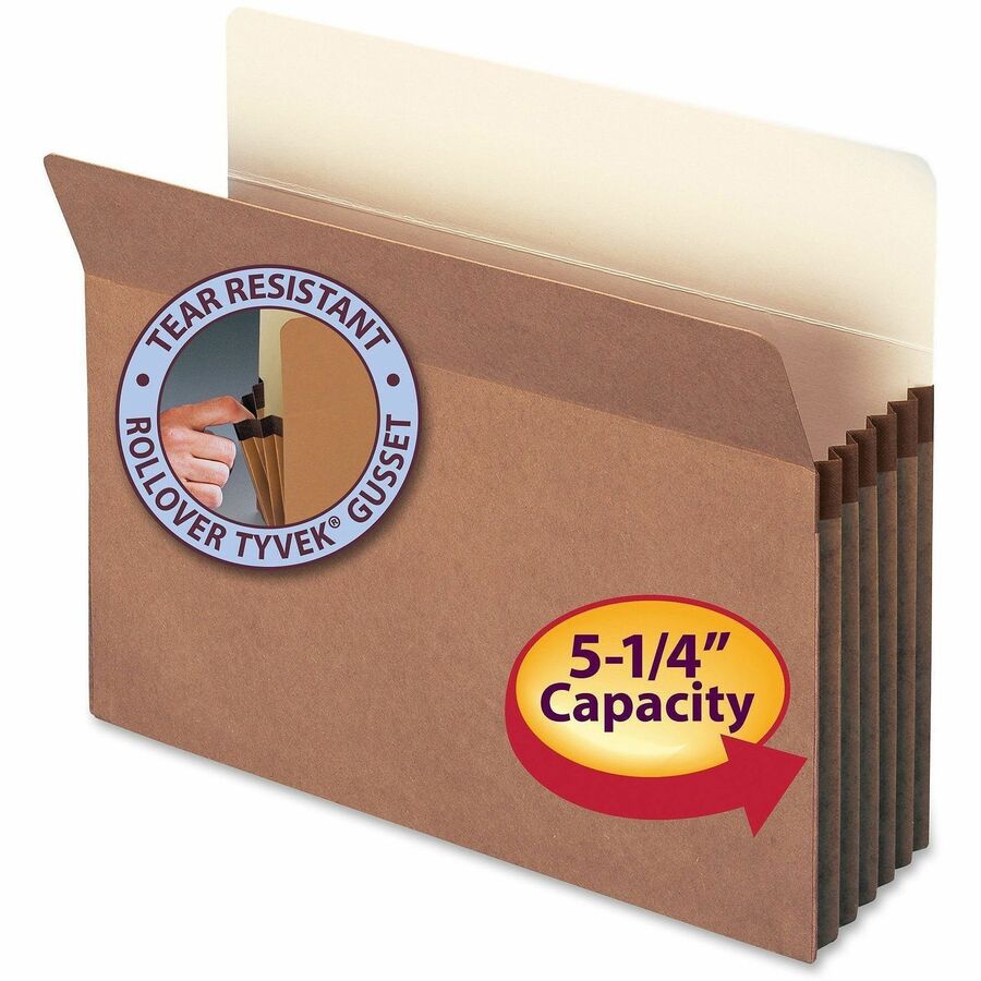 | Marketing Information | Great for managing bulky records, these sturdy file pockets feature an accordion design to hold up to a 5-1/4" thick stack of letter-size documents. Durable, tear-resistant reinforcement at the top of the gussets makes the sides of these pockets virtually tearproof. Straight-cut tabs offer plenty of labeling room. Other features include 12-1/2 point redrope back with 11 point manila liner, rounded top corners, 6-1/2" high redrope gussets and double-thick, 9 point redrope front. |