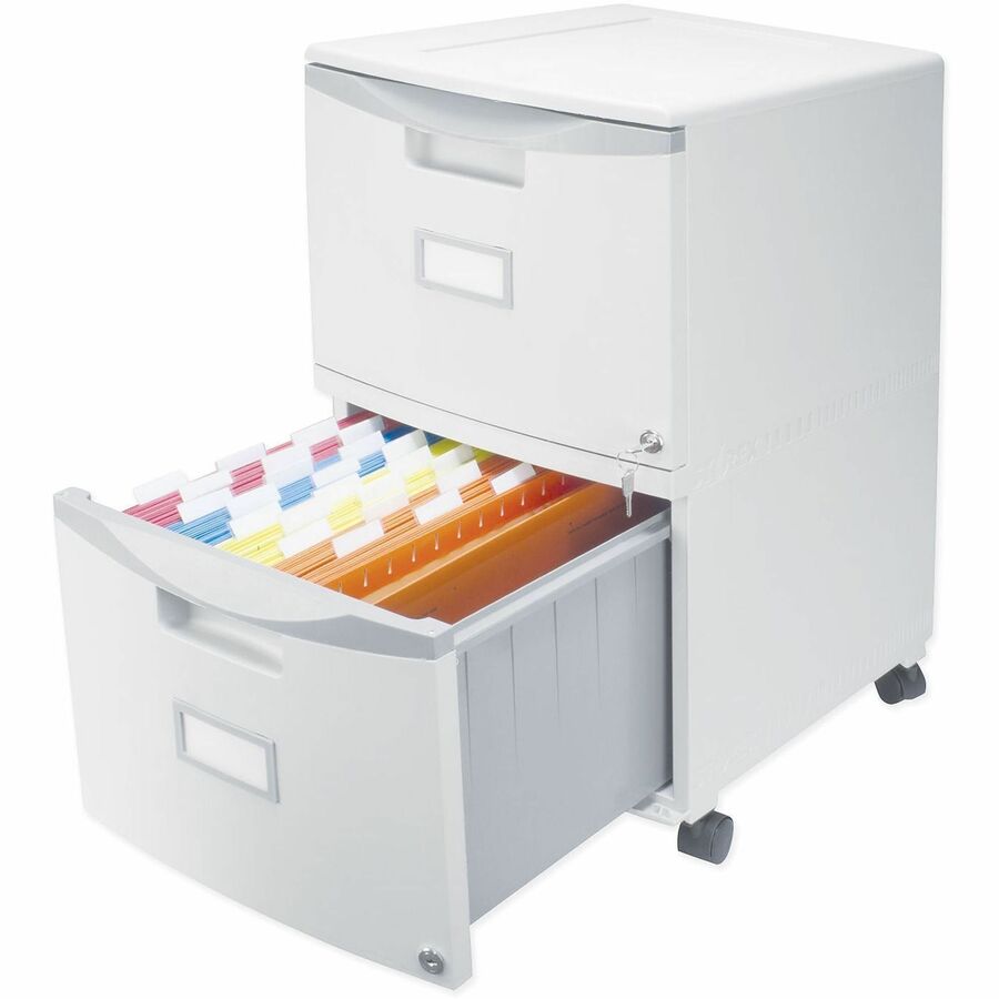 Functional and lightweight, this two-shelf file cabinet is the perfect storage solution for those in need of professional filing. Durable design allows you to vertically stack up to three additional cabinets (sold separately) for space-saving placement. Casters are lockable to stay securely in place without worry. Built-in label holder offers a convenient way to quickly identify your stored contents. Lockable drawers prevent unauthorized access to keep your files and documents safely contained. Polypropylene construction resists scratches, moisture and rust for long-lasting organization. |