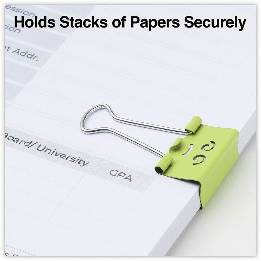 | Marketing Information | Express yourself with these fun, colorful, emoji mood binder clips. This binder clip comes in a triangular design. It provides strength and compression. Handles can be hung, folded flat against clipped material, or removed for permanent binding. Versatile use that makes them perfect for work, school, home and more. Whether you are feeling happy, sad, dazed or confused, one of these binder clips is for you. |