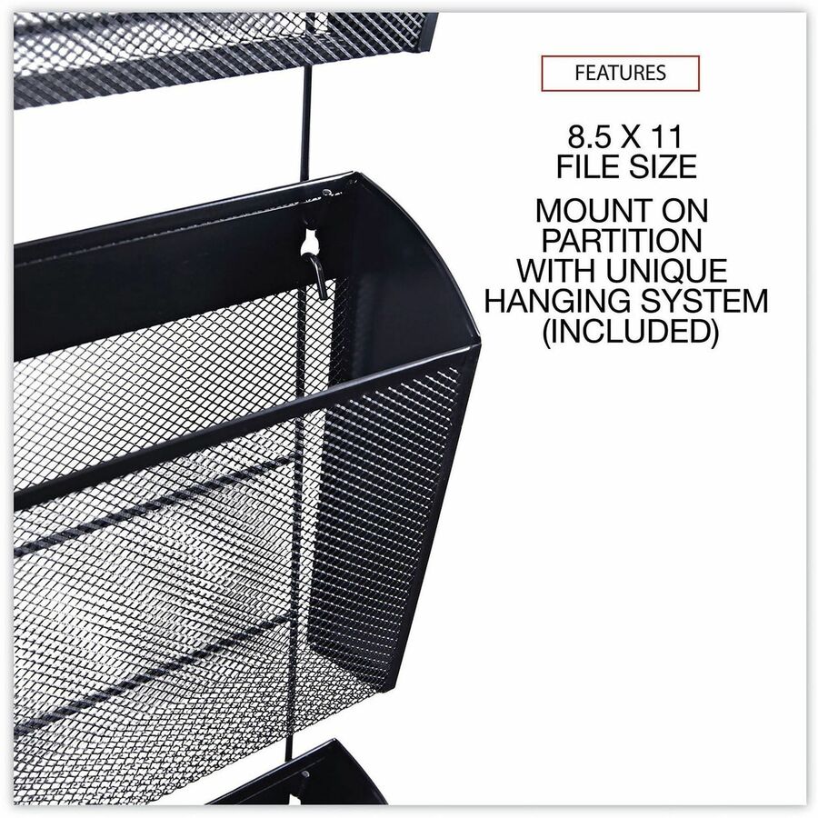 | Marketing Information | Keep important documents and files organized and at your fingertips with a convenient wall filing system. Durable mesh metal makes it easy to see any mail, papers, or files through the front of the file. Versatile design can be used one, two, or three at a time. The system mounts on partition with a unique hanging system (included). Sleek and contemporary style works with any office environment. |