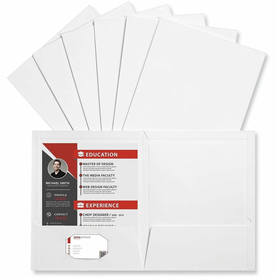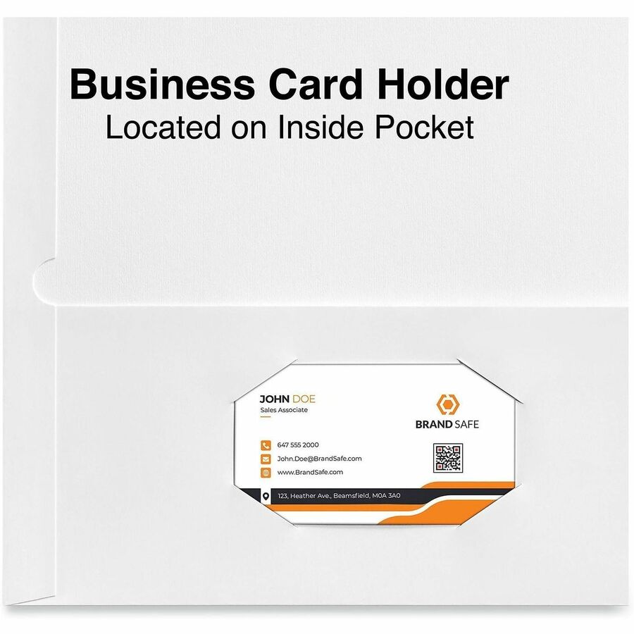 Convenient, laminated two-pocket folder is the complete solution for business presentations, keeping all of your documents neat and organized. Laminated high-gloss covers are durable and easy to wipe clean. Die-cut business card holder on the inside keeps contact information easily accessible. Generous capacity of up to 100 sheets per folder. |