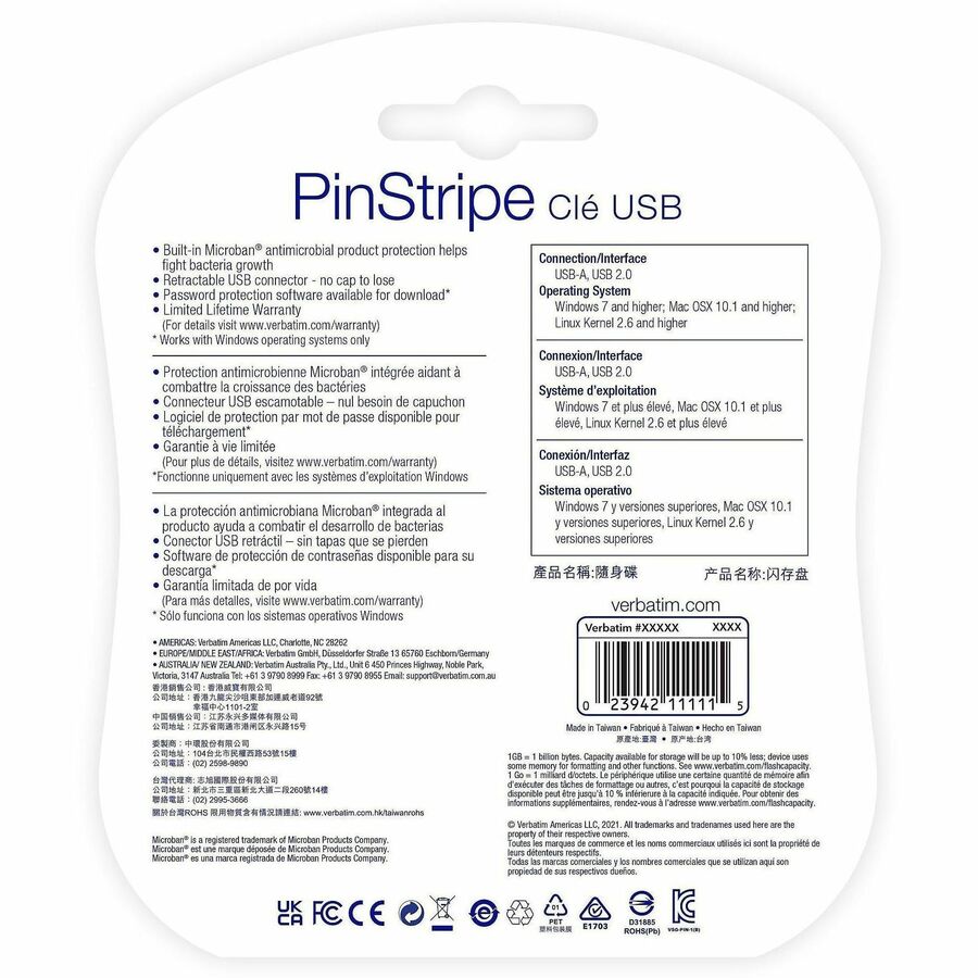 | Marketing Information | Portable and fast, ideal for all your storage needs! Available in a wide variety of colors and capacities, Verbatim® PinStripe USB drives make storing and organizing your important files quick and easy. The convenient cap-less design with retractable housing protects the USB connector and easily slides in and out. |